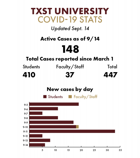 At Texas State University there have been 447 total coronavirus cases since March 1 — 410 among students and 37 among faculty and staff — as of press time Monday.