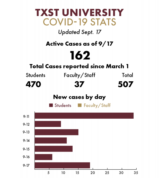 At Texas State University there have been 507 total coronavirus cases since March 1 — 470 among students and 37 among faculty and staff — as of press time Thursday.