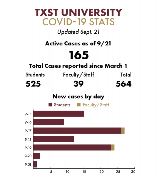 At Texas State University there have been 564 total coronavirus cases since March 1 — 525 among students and 39 among faculty and staff — as of press time Tuesday.