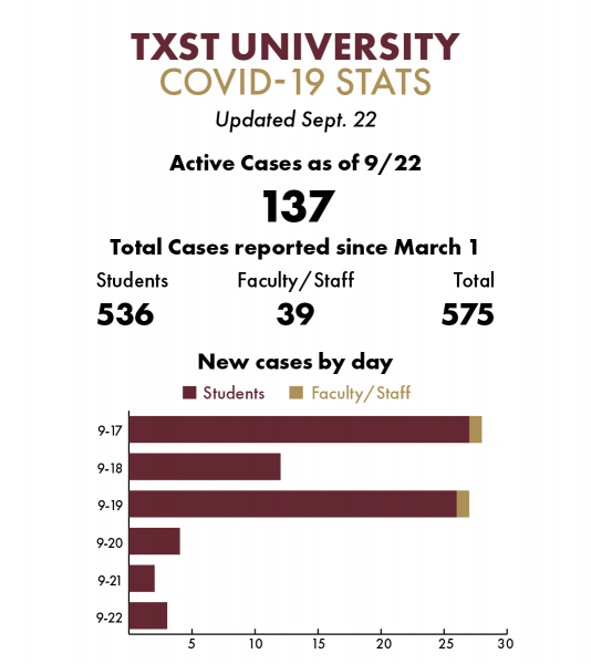 At Texas State University there have been 575 total coronavirus cases since March 1 — 536 among students and 39 among faculty and staff — as of press time Wednesday.