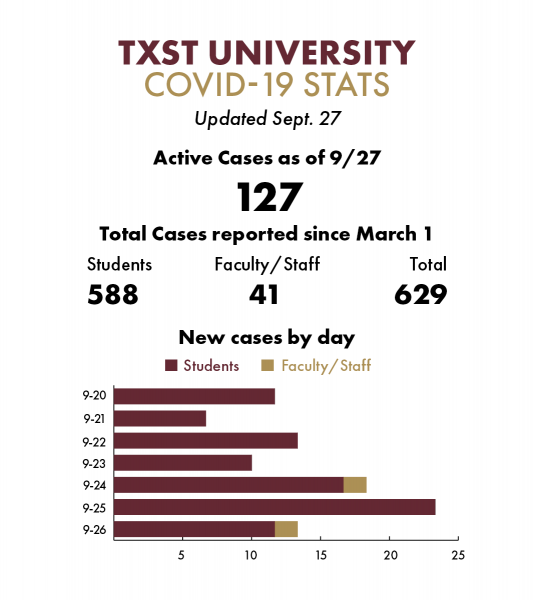 At Texas State University there have been 629 total coronavirus cases since March 1 — 588 among students and 41 among faculty and staff — as of press time Monday.