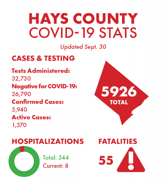 There are currently 1,370 active coronavirus cases — 86 fewer than Tuesday — and there have been 5,940 total cases since the first diagnosis of the virus in Hays County on March 14. The county also reported that there have been 414 active cases over the last 21 days — a 31-case decrease since Tuesday.