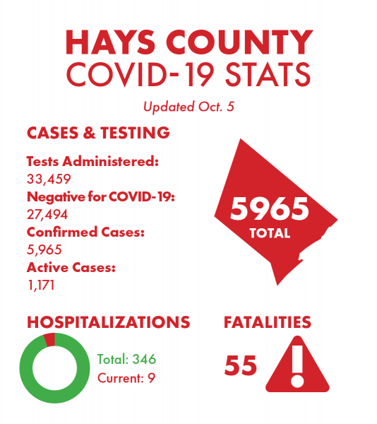 There are currently 1,171 active coronavirus cases — 106 fewer than Friday — and there have been 5,965 total cases since the first diagnosis of the virus in Hays County on March 14.