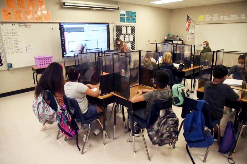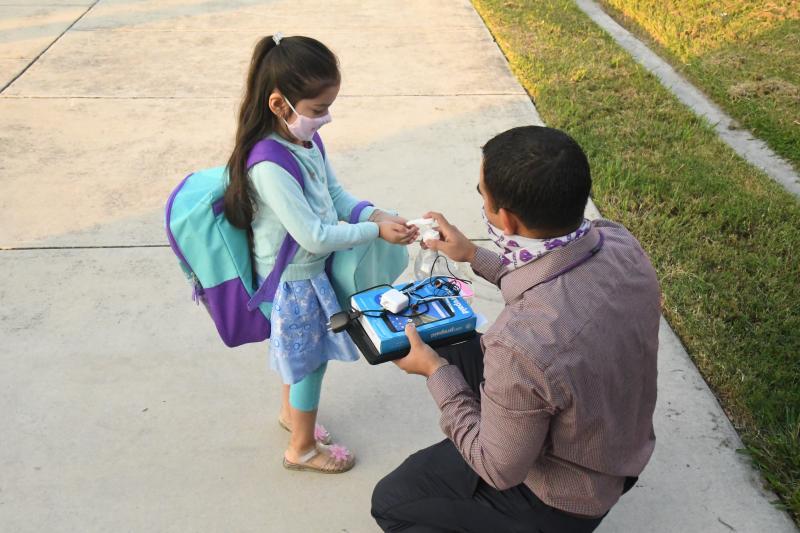 San Marcos Consolidated ISD welcomed students back to in-person learning Monday for the first time since March. As the COVID-19 pandemic continues, SMCISD schools operated at 50% capacity with students returning to class if they took a district-wide survey stating they wished to return to in-person learning. SMCISD begins the day by checking students' temperatures and providing hand sanitizer throughout its schools. Plexiglass partitions have also been added in classrooms. Students who chose not to return are still learning virtually. Pictured, students and staff at Mendez Elementary School on Monday.