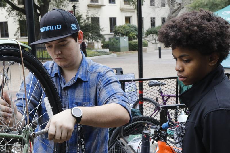 Bike technician Peter Fischer works on student Dejai Walton’s bike which hasn’t been riding well at the Bike Cave’s booth to promote safe cycling and bicycle repair.
