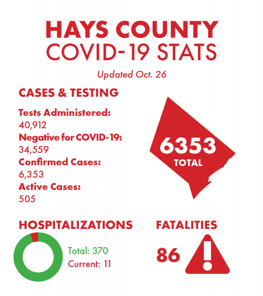 There are currently 505 active coronavirus cases — five fewer than Friday — and there have been 6,353 total cases since the first diagnosis of the virus in Hays County on March 14. The county also reported that there have been 305 active cases over the last 21 days — a 25-case decrease since Friday.