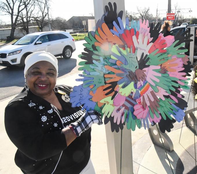 Dunbar Heritage Association Vice President Mittie Miller stands by a handmade wreath during Monday's MLK celebration. Daily Record photo by Lance Winter