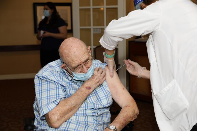 Above, Harry Wiede, a lifelong San Marcos resident, is given a COVID-19 shot.