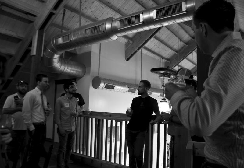 Members of the San Marcos Young Professionals look over the second-floor balcony to get a glimpse of the American white oak foeders where the Farmhouse Ales are fermented.